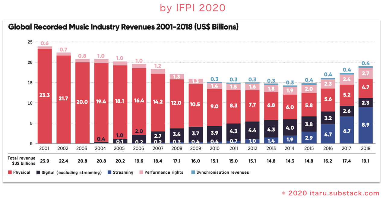 最後に、私の大好きなマーケットデータを貼って終わろうと思う。Spotify って元スタートアップ企業が 2008 年にできてから、音楽業界は下り坂を脱した。