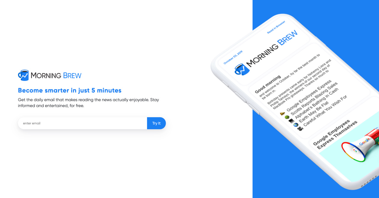 2015 年に始まった Morning Brew。若いビジネスプロフェッショナルのためにデザインされた毎日のニュースレターです。購読者は平均 28 歳で、金融・テック・コンサル系の読者が 30% を占めています。