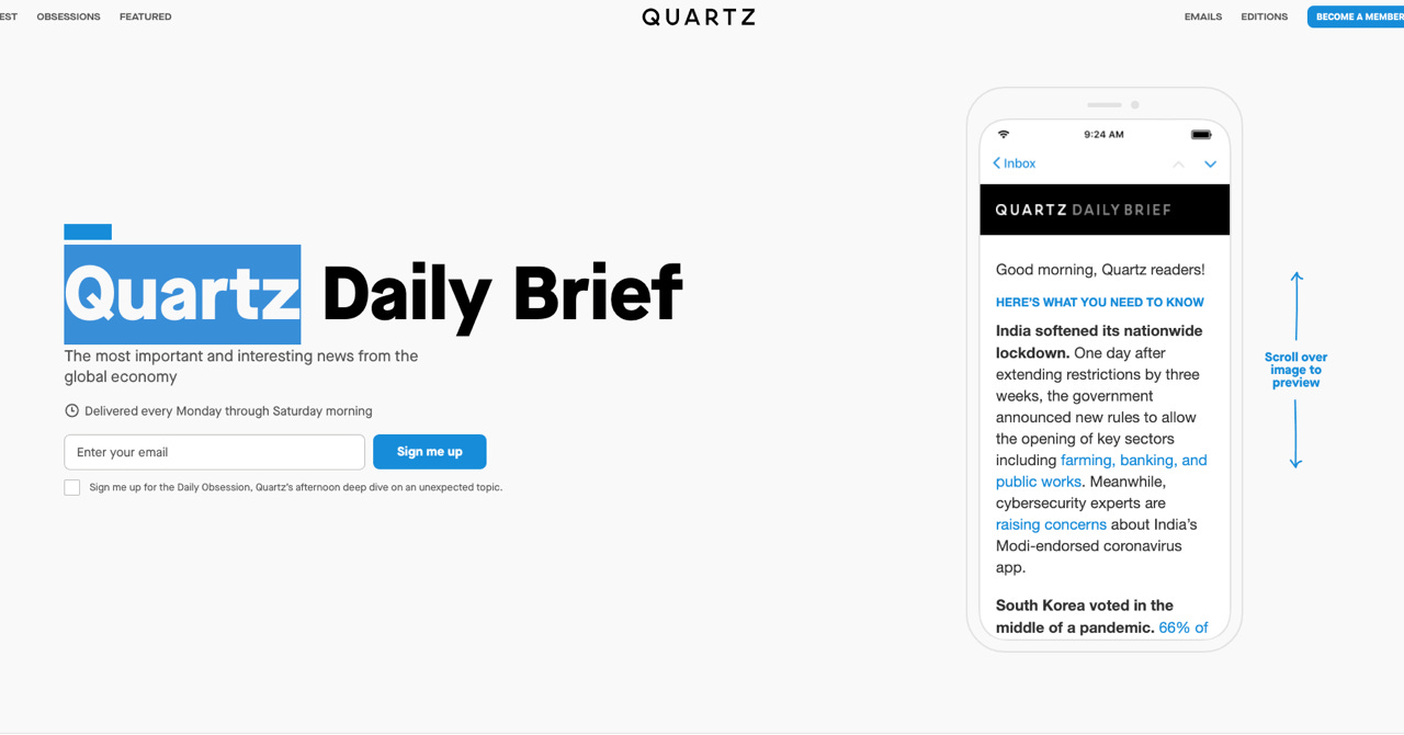 2012 年から始まった Quartz は、高収入ビジネスマン向けにビジネスニュースを配信しています。隙間時間にニュースを読んでもらうことを想定して、20 本の記事を選出して配信しています。