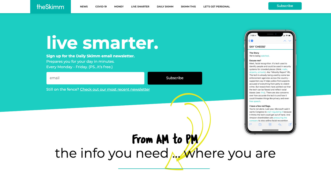ミレニアル世代の女性向けに、文化、政治、テクノロジーなどのトピックを会話形式で説明するニュースレターが theSkimm です。