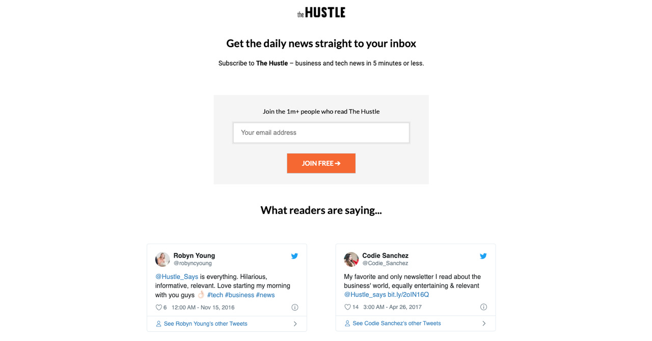 2015 年に設立され、シリコンバレーのリアルイベントを中心に広がったのが、The Hustle です。スタートアップコミュニティ向けにビジネスとテックニュースを届けています。